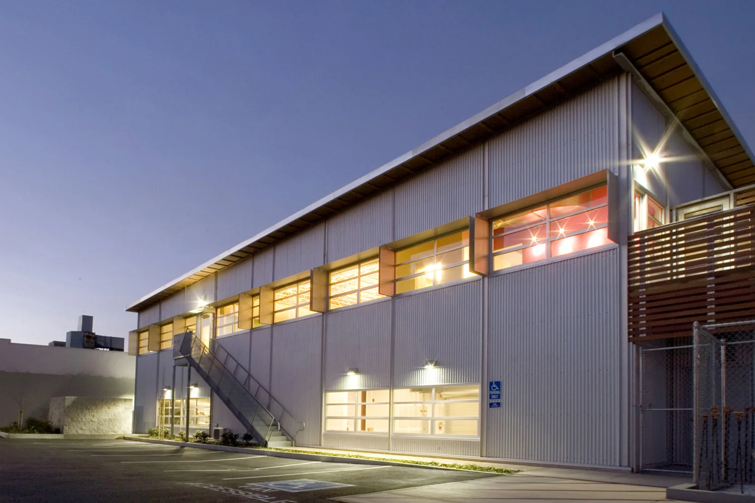 The commercial complex integrates modern details and sustainable design principles in a building that fits comfortably within its 20th century light industrial context. The owners developed the two-wing complex to accommodate ground-level light industrial tenants and upper-level spaces for their own architectural office and studio, along with office spaces for other design and engineering firms.